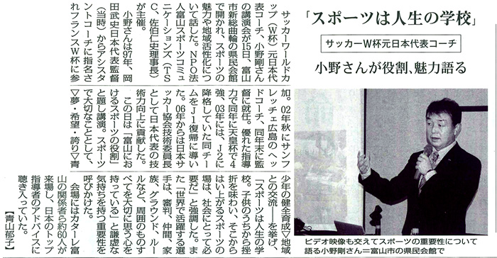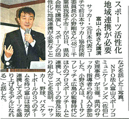 12月 | 田嶋幸三氏による講演会。「世界を目指す日本サッカー~スポーツが果 たす社会貢献について~」(富山県サッカー協会との共催) |